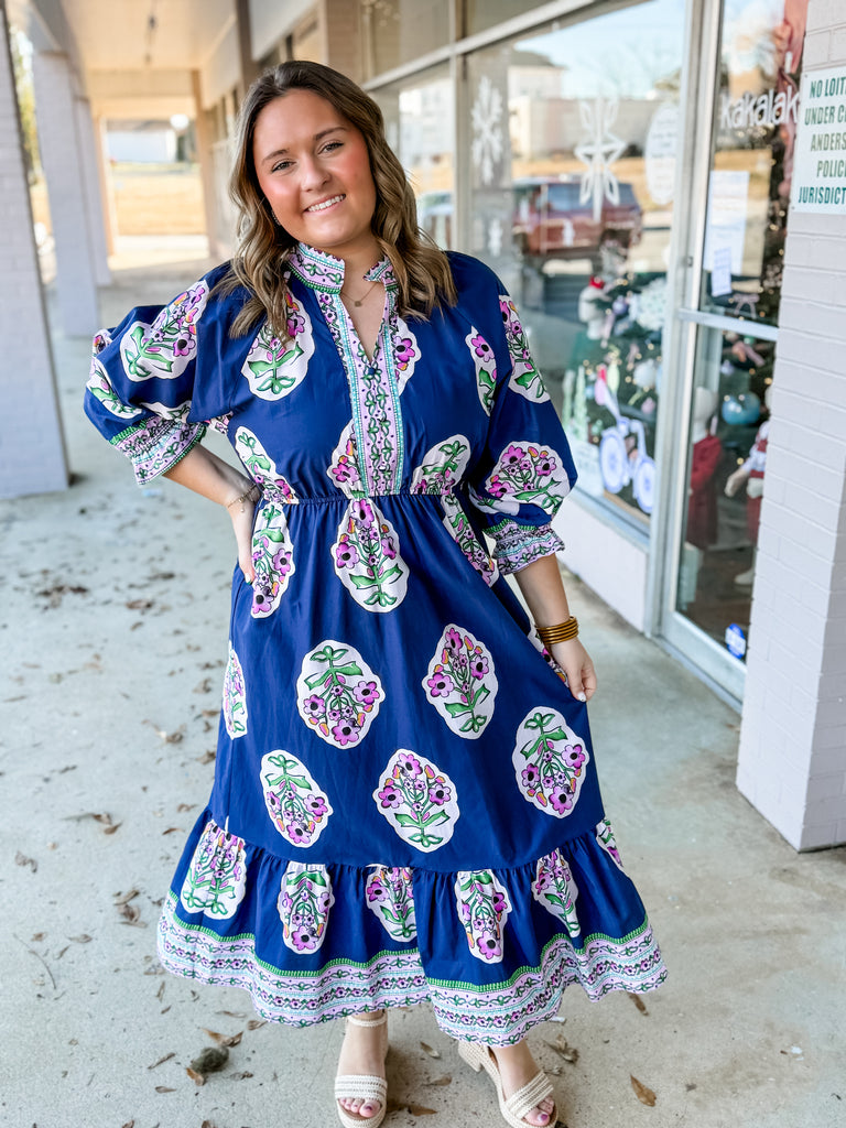 Make a stunning statement in this vibrant navy floral maxi dress! With its eye-catching pink and green botanical print, intricate patterned trim, and flattering gathered waist, this dress blends boho charm with bold personality. The long sleeves with smocked cuffs add an elegant touch, while the flowy skirt creates beautiful movement with every step. Perfect for spring events, brunch dates, photos, or anytime you want a dress that stands out in all the best ways.